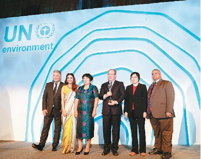 北京时间2018年9月27日,浙江省“千万工程”荣获联合国“地球卫士奖”中的“激励与行动奖”。图为颁奖现场。